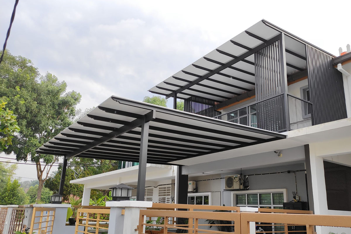 Pemasangan awning dan kemasan tambahan di bahagian luar rumah.