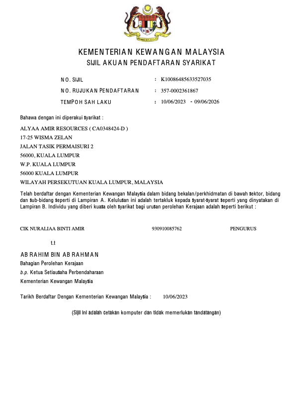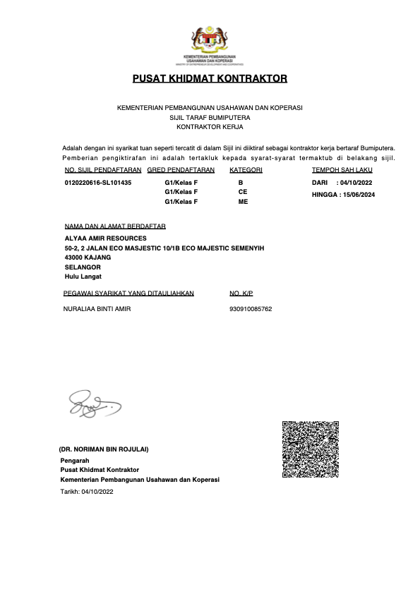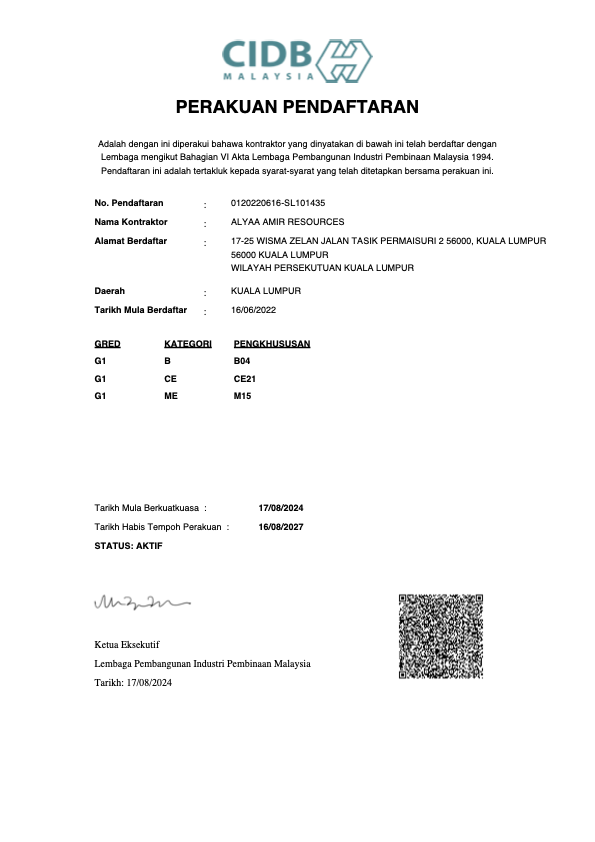 - Mematuhi Piawaian Industri: Mematuhi semua keperluan undang-undang dengan pendaftaran rasmi CIDB, memastikan kualiti dan keselamatan dalam setiap projek